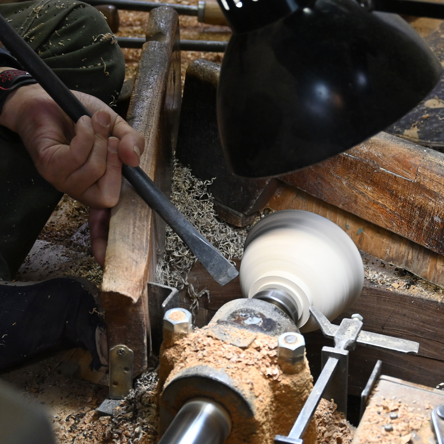 木を削り、器の原型を作る工程。素材の選定から形状まで、木地師の感性が光ります。