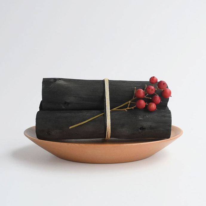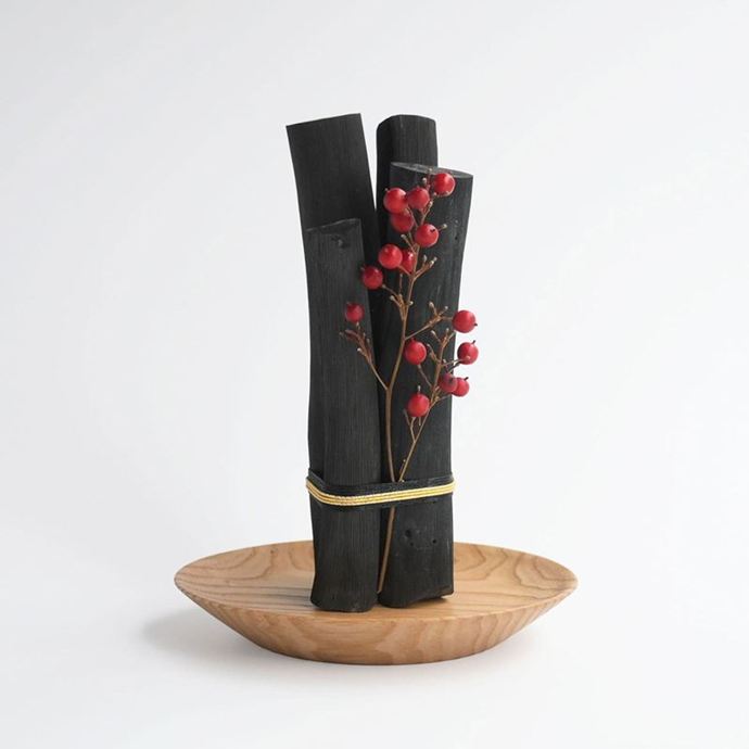 木目をいかしました。端正な鏡面の備長炭を水引で束ね、南天の実を添えることで、季節の彩りを演出しています。