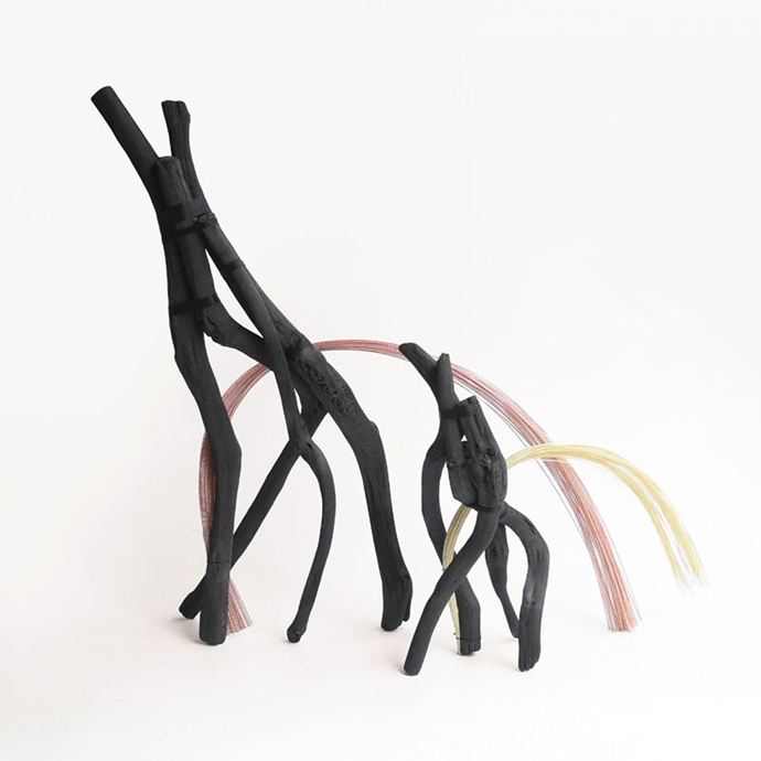 曲がりが個性的な備長炭を組み上げ、親子馬のかたちに仕上げました。毛並みの様に艶やかな備長炭と尾に見立てた水引がお正月を彩ります。